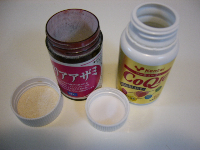 そこで、写真の様なサプリの空ボトルを使用します。各ボトルには、その時その時摂取するサプリを予めブレンドしておくのです。そして、飲むときにはフタを開けたら一気にザザーッと口内に流し込み飲料水で飲み下します。