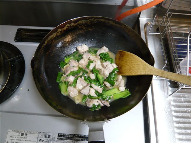 3、大ぶりに切ったチンゲンサイと鶏がらスープを投入