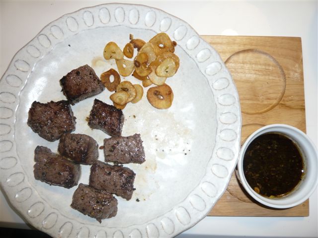ステーキを焼き終わったら、すぐに肉を取り上げ、残った肉汁にワサビと醤油を入れてソースを作る。