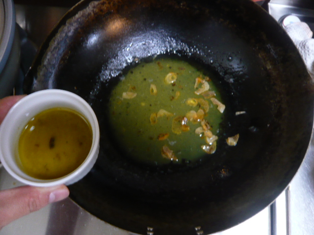 ニンニクがキツネ色になったら、ニンニクを取り出そう。