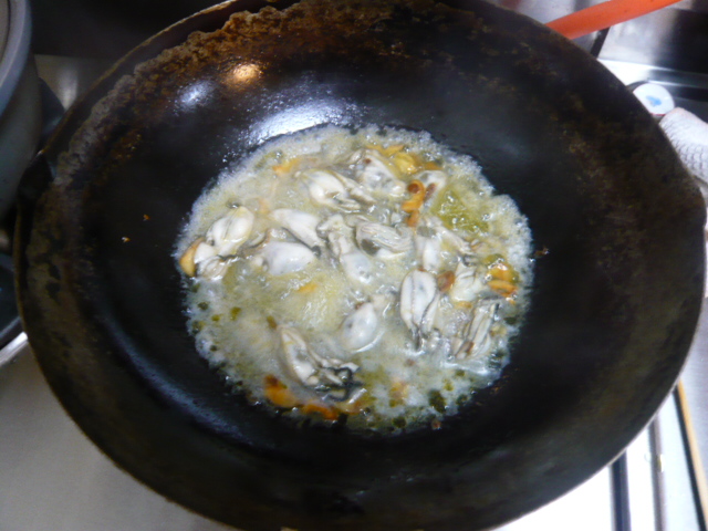 ニンニクを取り出したら、牡蠣を投入する準備。