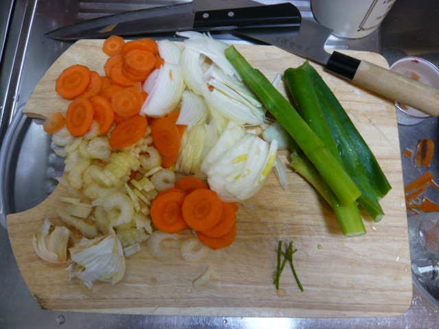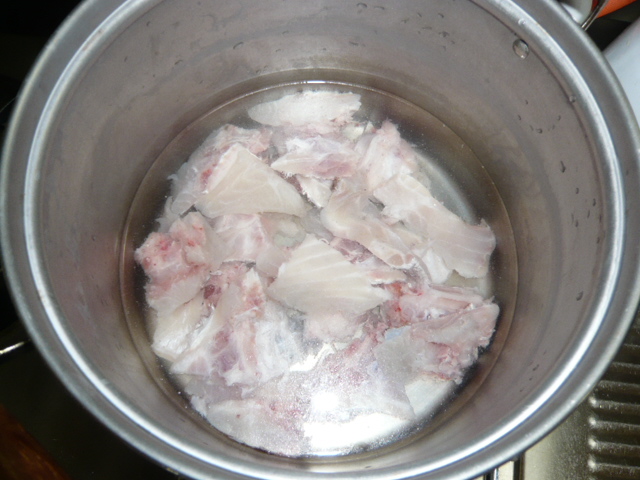 フュメドポワソンは、白身魚のアラで作る淡白な風味の魚だしで、本によっては、缶詰を買えとも書いてあるようだが、マスターの勘では、どうやらこの魚主体のベースの出来如何が勝敗を分かつような気がする。