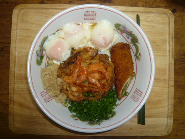 トレーニング直後の栄養補給は、グルタミン+アミパ。その後のセカンドポストワークアウトの栄養補給は、讃岐うどんに温泉卵などをトッピングした昼食を兼ねた軽食。