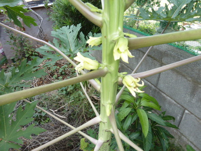 ほんの冗談で植えたパパイヤが10月下旬に開花。雄株と雌株が基本的には別(一応複数植えた)なので結実はしないだろうと思っていたら受粉した模様。霜が降りれば、終わりだけど。