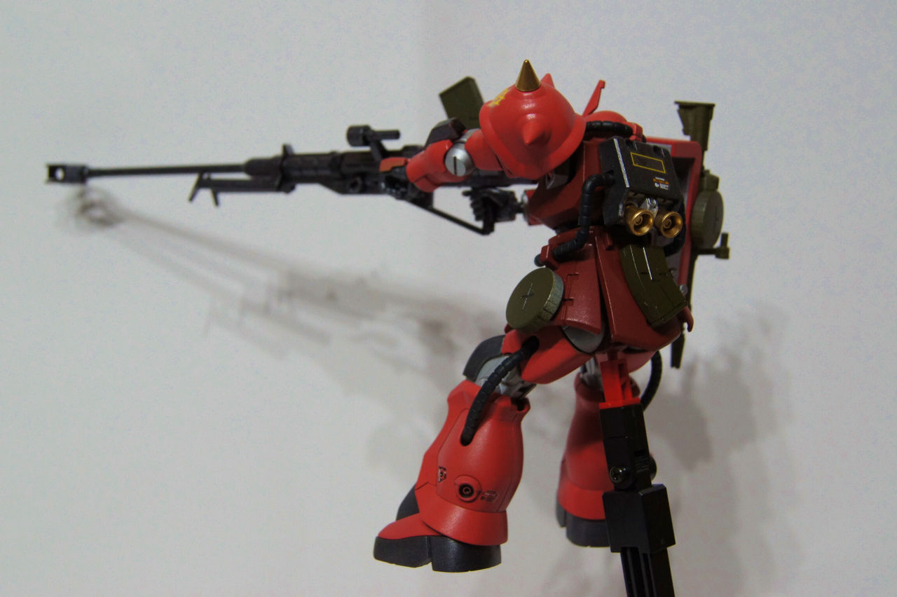 写真は午前7時30分、少数生産された135mm対艦ライフルを構えるMS-06F2、ハナザワ機。