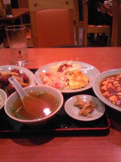 中華の外食。定食(酢豚・蒸し鶏・ニラ玉)と麻婆豆腐。ご飯はお代わり自由なので3杯食べました。