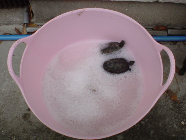 10分後、またも亀を見つけて停車。臭かったので、ミコナゾールと塩素にしばらく浸けておいた(←鬼)。