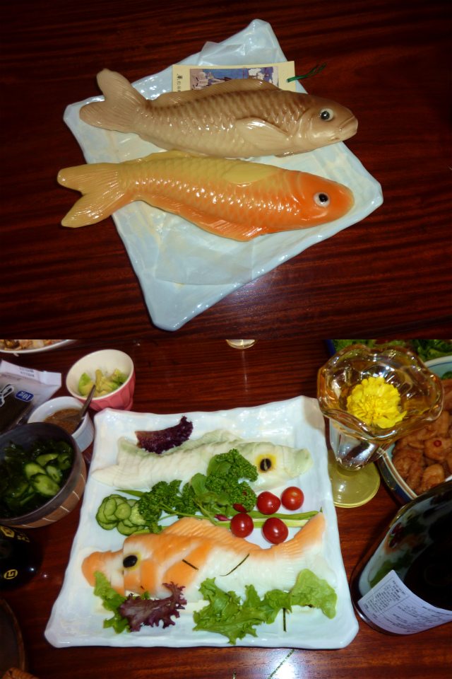 長崎から届いた鯉を象ったカマボコとアンコ菓子が届いた。ちなみにこの辺の習わしでは、赤子は誕生日に大きな餅を背負うので、餅を注文して背負わせた。
