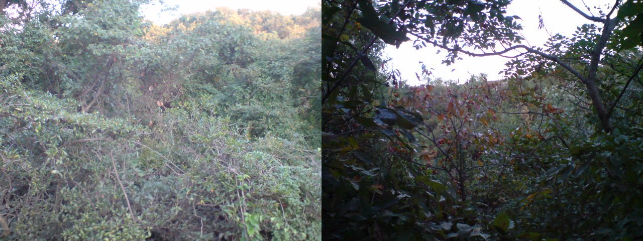 アケビの種をベッベと吐き飛ばしながら歩くと、とても小さな柿の実を付ける木を見つけた。どんな味がするのか試さないといけないので、高枝切りバサミの出番だ。