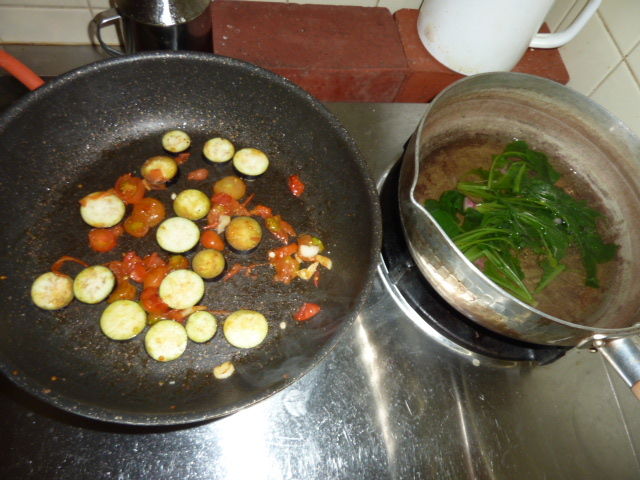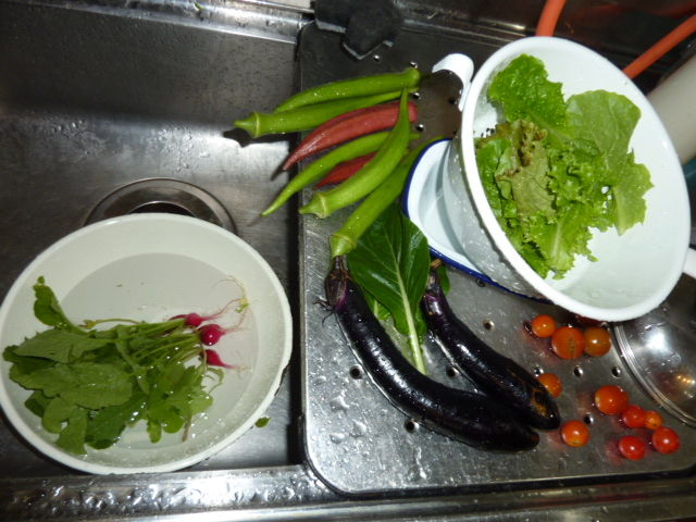 トマトとナスを炒めた。ラディッシュの葉と根先は、味噌汁の出しに使う。