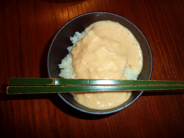 ご飯にかけて食べる。旨し。ただし、白米なのが残念。