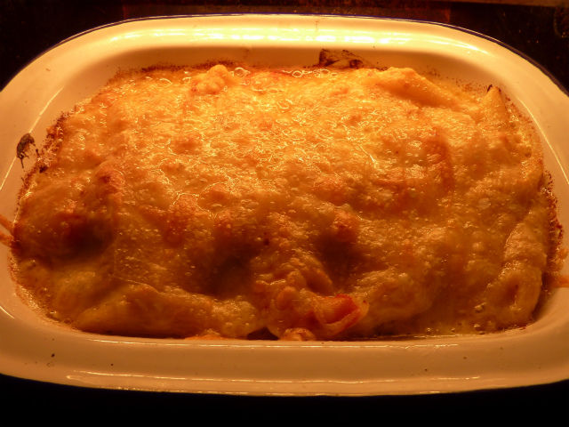 日曜日に作っておいたエビクリームで、エビとマカロニのグラタン。