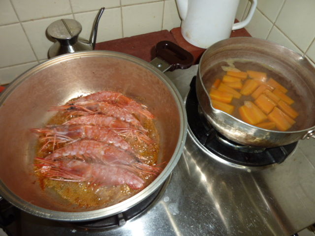 エビクリームを作るため、有頭エビを炒めた。同時にジュースとサラダに使用するため、ニンジンを茹でた。