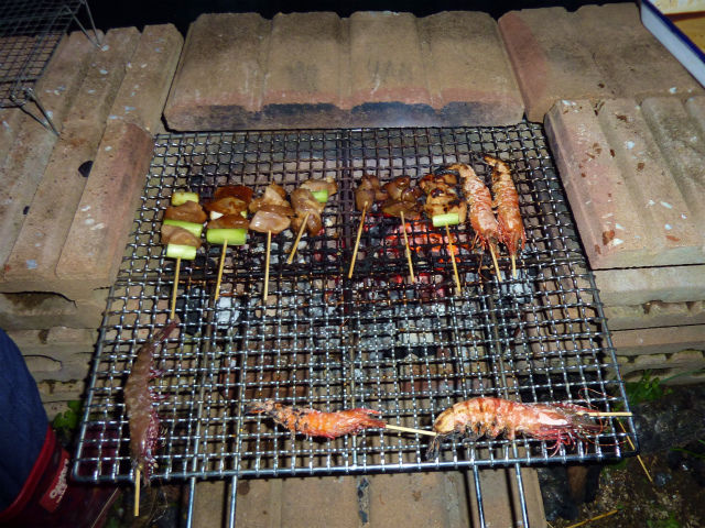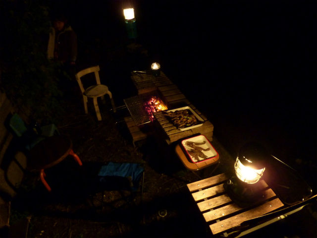 夕方。焼鳥開始。ガスランタンに加え、アウトレットで買っていたガソリンランタンがデビュー。