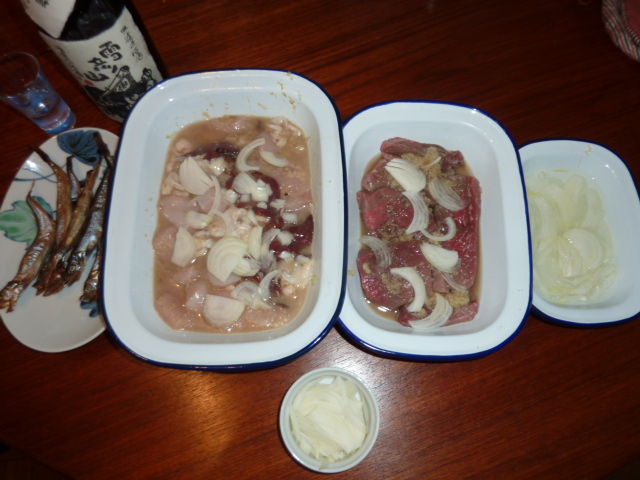 無性に焼鳥が食べたくなったので、もも肉とレバーと皮をタレに漬け込んだ。ついでに今晩食べる予定の牛の赤身をマリネ液に浸した。