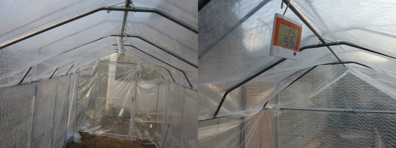 寒い日は作業しないというダラダラスタイルで、ビニールハウスがようやく完成。外側に加え内側にもう一重ビニールを張る二重構造のタイプ。夕方なのに19度ある。でも、夜はストーブを焚いて保温。