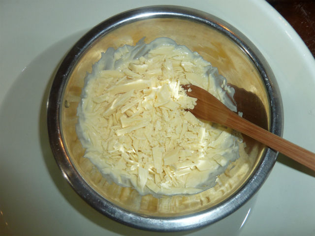 ...3生クリームを沸騰させてから、メインのチョコを溶かし込んで、ガナッシュを作る。