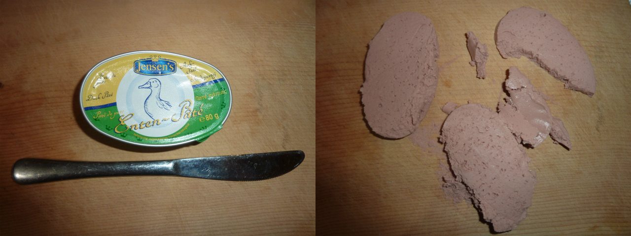 カルディや成城石井などの輸入食材店で、フォアグラパテを手に入れよう。これはフォアグラが何パーセントか含まれたフォアグラ風味のパテだ(450円くらい)。