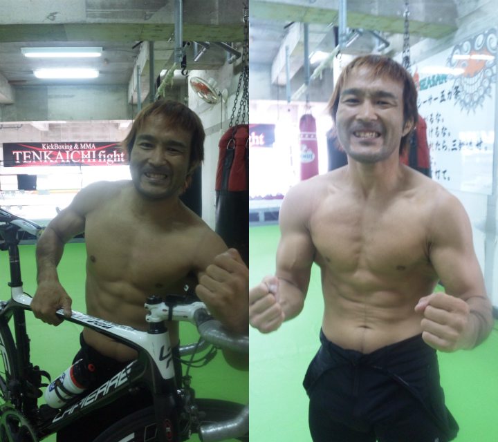写真は、前回の総合格闘技の試合から3ヶ月間全くウエイトトレーニングを行っていないのに筋肉がそれほど落ちてこないという体重72.8Kgの花澤選手。