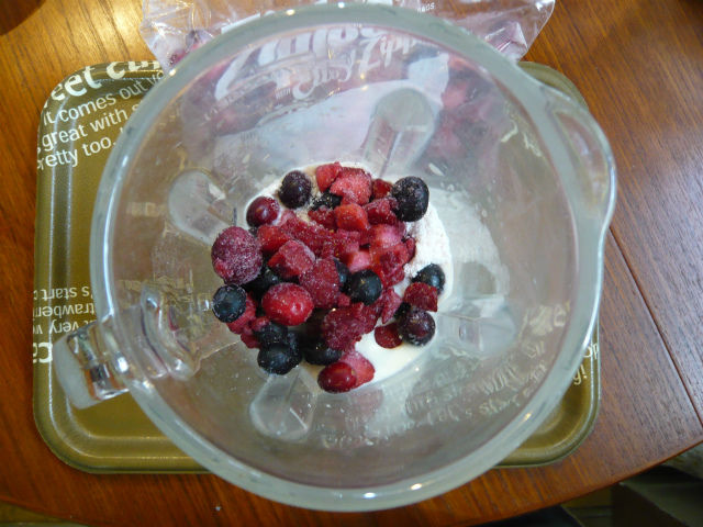 ...3冷凍庫のミックスベリーを一つかみ放り入れる。