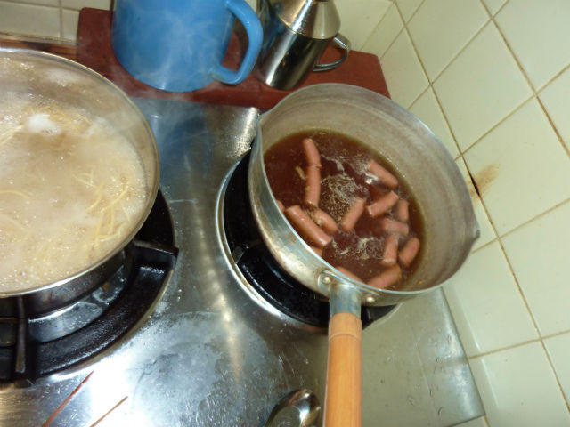 少し脂っ気が欲しかったので、切り刻んだソーセージをスープに入れて加熱した。見た目はアレだが、大変美味しい。