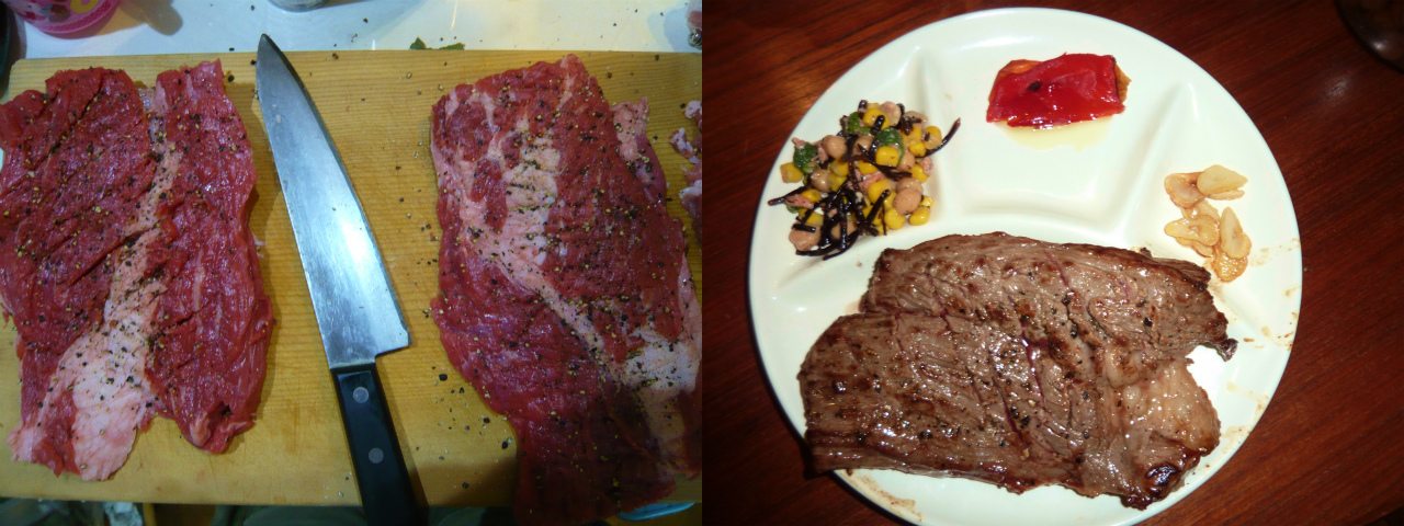 夜、スーパーで元から安いOGビーフが半額になっていたので購入。とても火が通りそうになかったので、半分にスライスした。それでも400gあるので、味はともあれ食べ応えはあった。