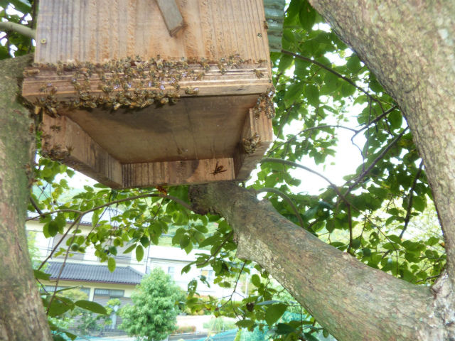 ミツバチの巣には、様々な種類のスズメバチが来訪する。巣を丸ごと襲う殲滅戦ではなく、外勤の働き蜂を1匹だけさらうという地味な戦法なので、放置しておいても問題ないと思われるが、薬剤の使用なしにスズメバチを生け捕るチャンスである。