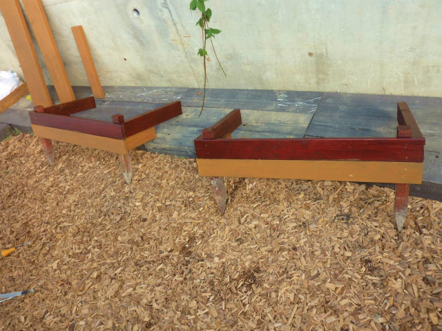 2時間目は、果樹の株元をスッキリさせるお洒落アイテムを廃材で組み立ててツートンカラーに塗装。