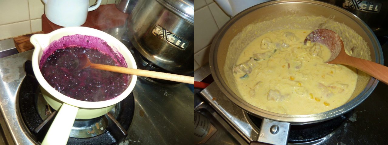 10月末に友人宅で狩らせてもらったブルーベリーをジャムにした。次に当地で11月頃に出回るトウモロコシをコーンクリームにして、鶏肉などを入れて、それっぽいものを作ってみた。名前はない。