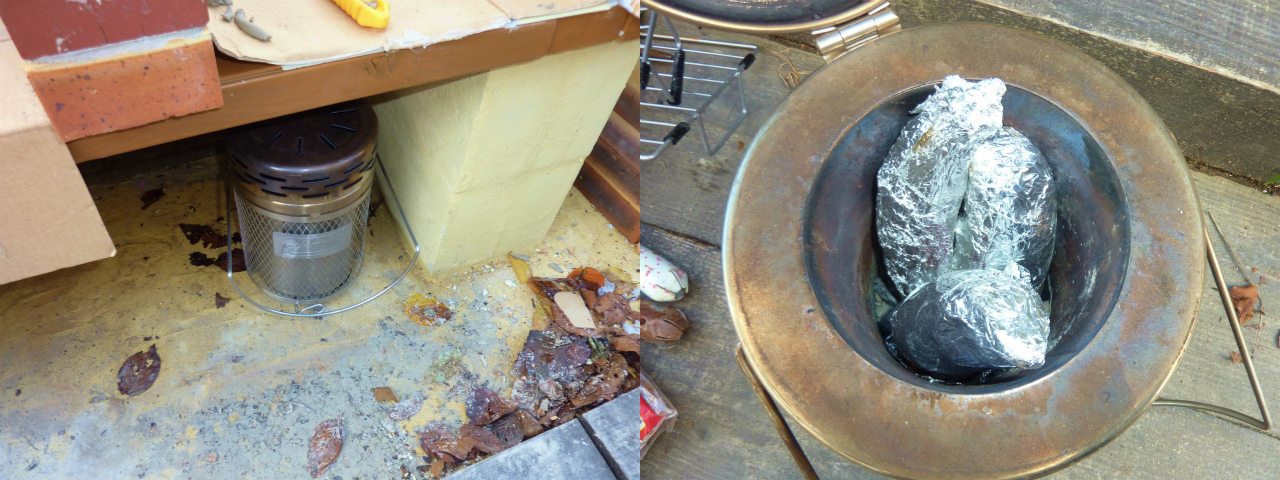 外での身体を大きく動かさない作業は寒いので、最近はコールマンのチャコールストーブをよく利用する。構造物を利用するとかなり暖かい。そして、ただ炭を燃やすだけでは非生産的なので、アルミを巻いたサツマイモを入れておく。すると、どんなに工夫して焼いた焼き芋も全く敵わないくらいトロトロ旨旨の石焼き芋風が出来上がる。後に残った灰は、果樹の株元に。