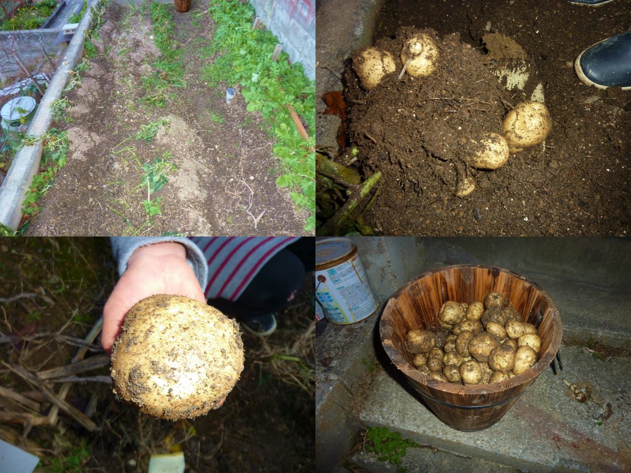 連日の霜で、生長しきる前にじゃがいもが萎びてしまった。これ以上待っても、ジャガイモの肥大は望めないので、子供の帰宅を待って収穫した。予想に反して大きく育っていて、得してないのに得した気分。