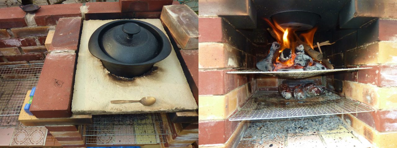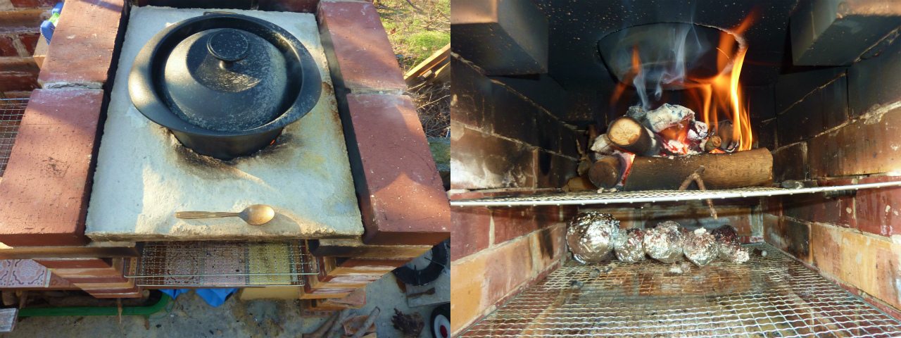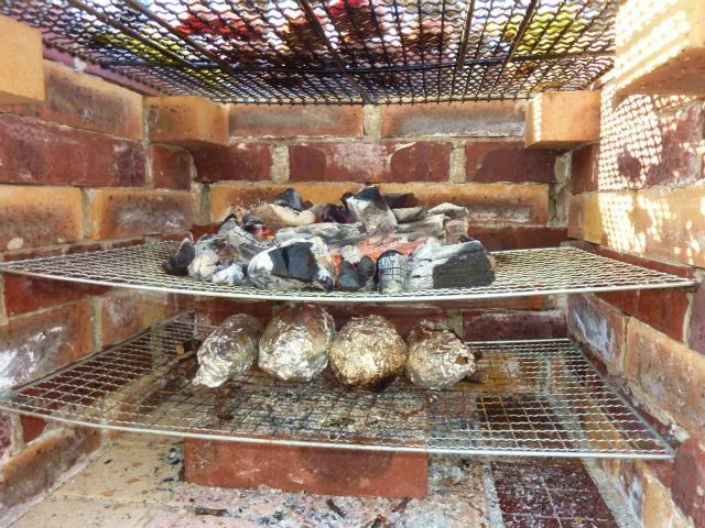 一昨年の剪定枝で炊く飯の水面下(火床)では、熱エネルギーを無駄にしない為、サツマイモが並べられている。