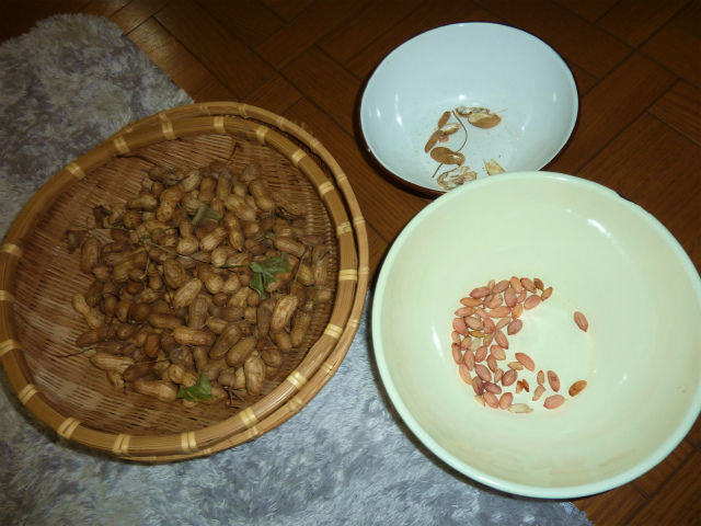 帰宅後、家族みんなで落花生の殻割り。一人で行うと、指が痛くなるだけでなく、寂しさで胸まで痛くなるが、みんなでやれば早く終わるので、倍率ドン。