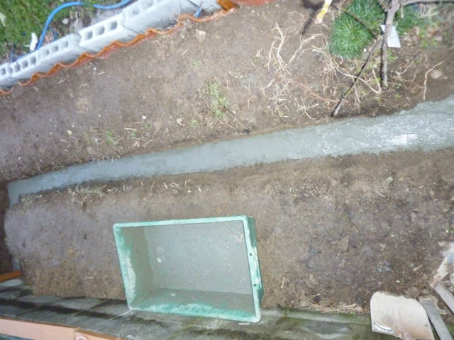件の溝が水平になるように何度も修正し、固めた後、インスタントコンクリートを流し込む。コンクリートをこねる段階で既に腰がカチカチになってしまう。