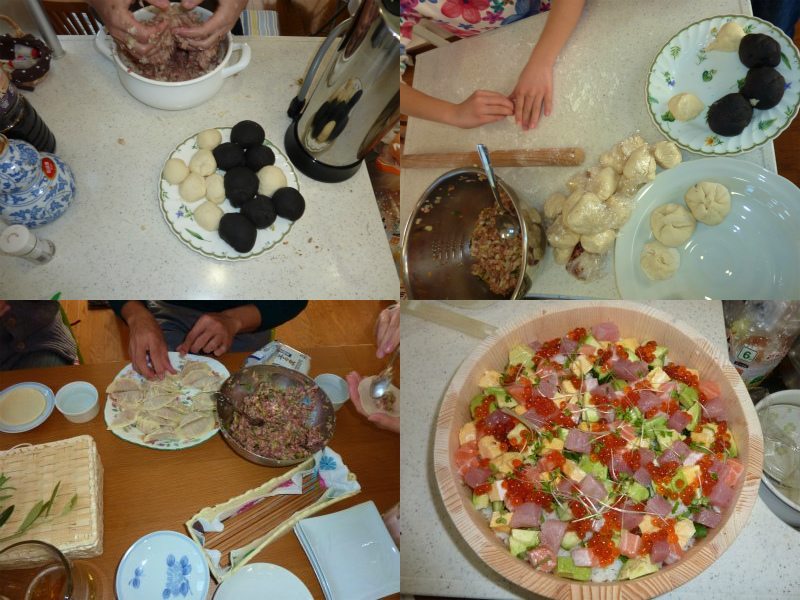 本日のメニューは、餃子、焼売、肉まん。どれもミンチを使用するので、まずはボウル3つにそれぞれの具を仕込む(共通具材が多い)。3つのボウルが完成したら、チームを3つに分け、手分けして包む。ちなみに黒いのは、イカスミまん。