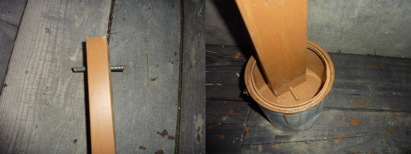防腐加工済を使用するが一部が地面に埋まるので、ステイン処理をした。これに穴をうがって廃材の鉄骨を通す(廃材なので心許ない短さ)。
