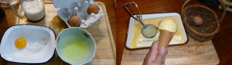 で、上の卵と生クリームを使って、今日はアイスクリームを作った。材料は、卵黄、クリーム、砂糖、バニラビーンズ、少量の牛乳・・・と、クレームブリュレと全く同じ。