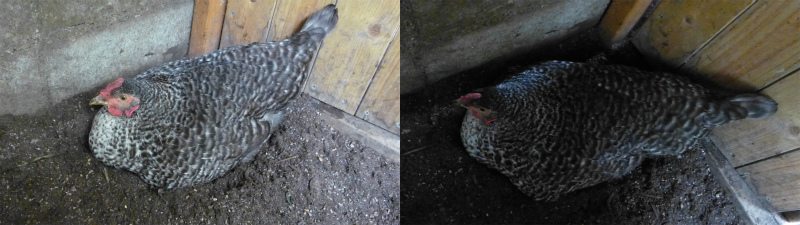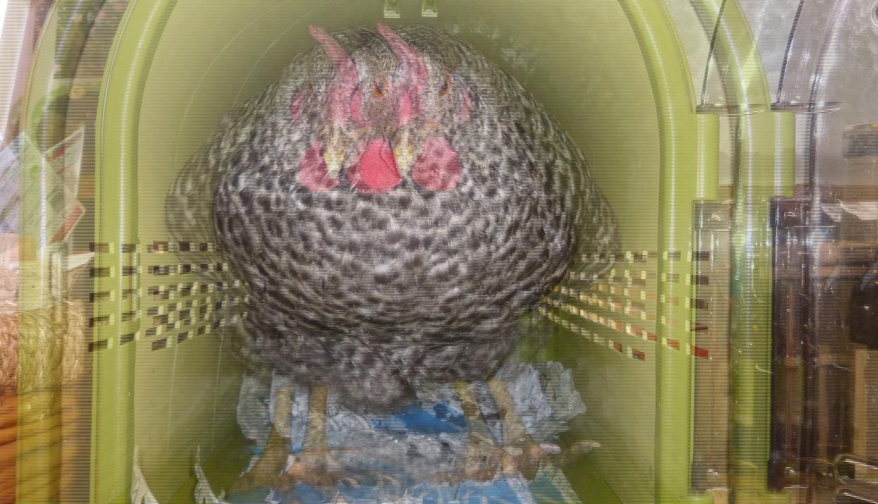 最後に3Dチキン。オモチャの3Dカメラでも、上手くいくと良い3D写真が撮れる。本当にモニターから頭が飛び出る。この写真はウェブ用に加工した為、少しおかしくなってしまっている。ちなみに、箱は犬猫の移動ケージで、産みすぎる子のペースを落とす為に隔離絶食させる手段として購入したが、現在は産みたいのに中々出ない子を入れる産卵部屋として利用。