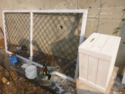 卵を産む巣床の順番待ちが出来るようになったので、増設。といっても、出来合いの収納BOXを買ってきて防腐処理するだけ。糞尿で腐らぬよう、キシラデコールを3度塗り。