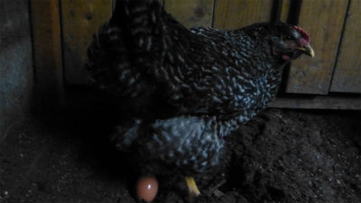 大抵の鶏は、卵を産む際に狭い産卵箱を好むが、この子は地面に穴を掘って産むことが多い。肩に乗ってくるくらい人間慣れしていた為、庭のニワトリゾーン以外の場所にもしょっちゅう連れ出され、良い生き餌を食べていたせいか、身体は小さめなのだが、3番目に大きい卵を産み、その質は最も良い。