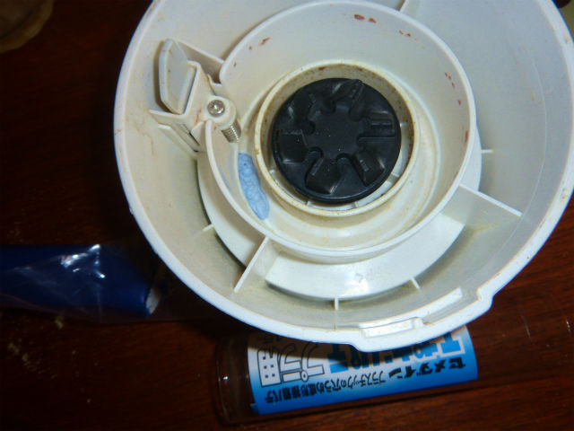 時々蛎殻を粉砕していたせいか、コーンのせいか、ミルサーの本体が削れて穴が空いたので、エポキシパテで補修しているの図。