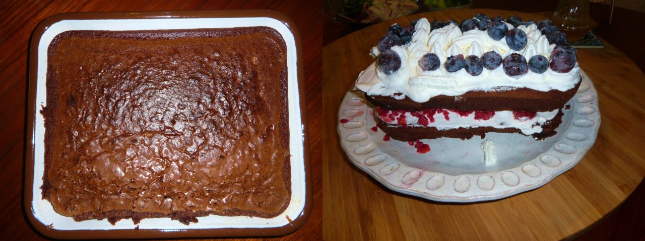 夕方、娘さんとブラウニーを焼いて半分に切り、冷凍していたラズベリーとブルーベリーを甘くホイップした生クリームでデコレーションし、冷蔵庫で寝かせた。