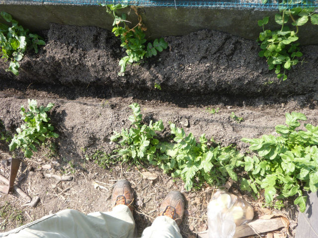 フランス原産で長崎育ちのジャガイモ「シンシア」の植付け。といっても、他の作物が成育中で植えるスペースがなかったので、畝の真ん中を深く掘って、その谷間に植付けた。他の作物を収穫し終えた頃に、その土をジャガイモの土寄せに利用できるだろうという目論見。