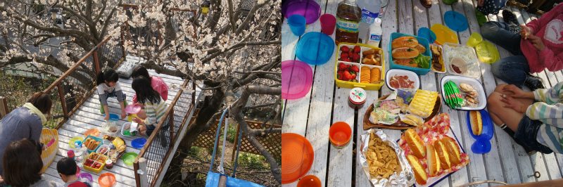 友人家族二組を招いた赤子のお披露目会。外で、ハムサンドや卵サンドなどを食べた。