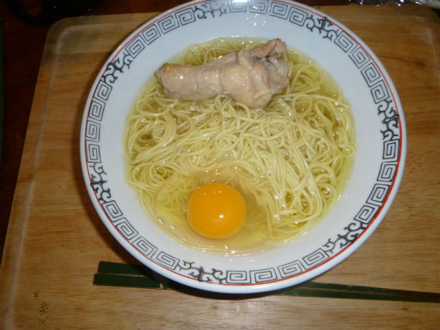 あるものを作ってみるかと、鶏ガラスープを作った。その余剰分で、ラーメンを作ってもらった。いつもは自分担当であるが、今回はワイフ作。揚子江ラーメン以上にシンプルな汁ソバやーん(梅田ネタ)!