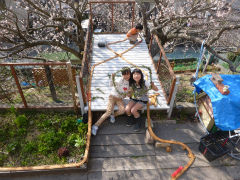 庭のチェリーが3分咲きくらいだろうか。娘さんは、友人とリース作り。