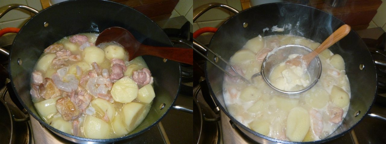 鶏ガラスープベースのクリームシチューを作った。ベシャメルソースを溶かし込む際、味噌こし器が活躍。