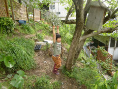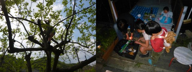 一方、娘さんは柿の木のてっぺんに登っていた。夕方、私は疲れてグロッキーであったが、何故か夕食は庭飯ということになった。