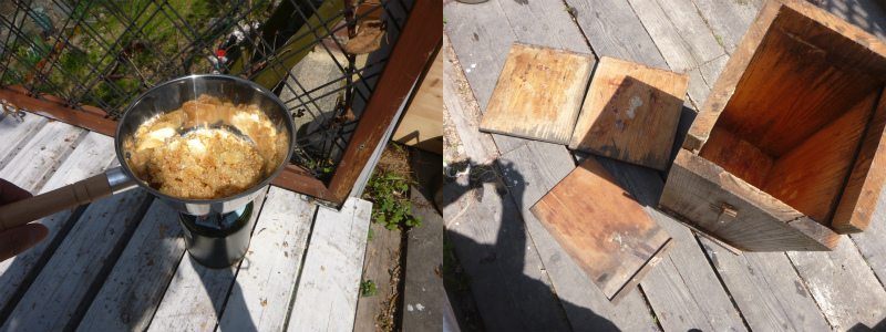100均の雪平鍋に蜂蜜がついたままのミツロウを入れて、シングルバーナーで溶かす。溶解液をミツバチの巣箱の内側に垂らす。ミツバチが入るようにおまじない。