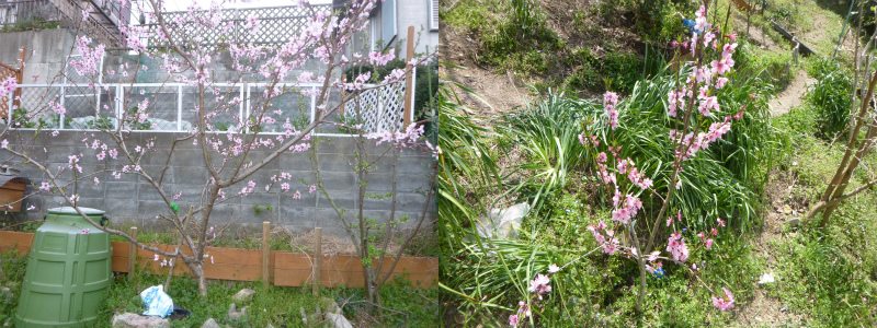 で、桃が満開であるが、最初に植えたあかつきと川中島が3m以上になった。それらに比べて、植えて2年目(接木3年目)のひめこなつは、こんなに小さいが結構実を付ける。
